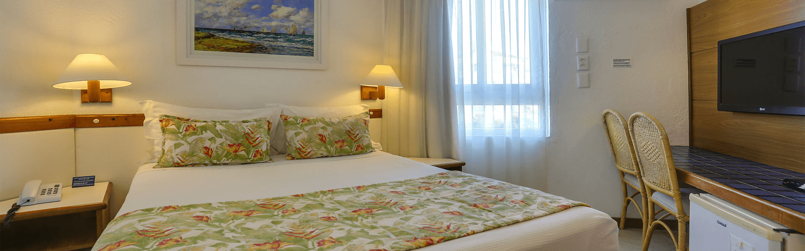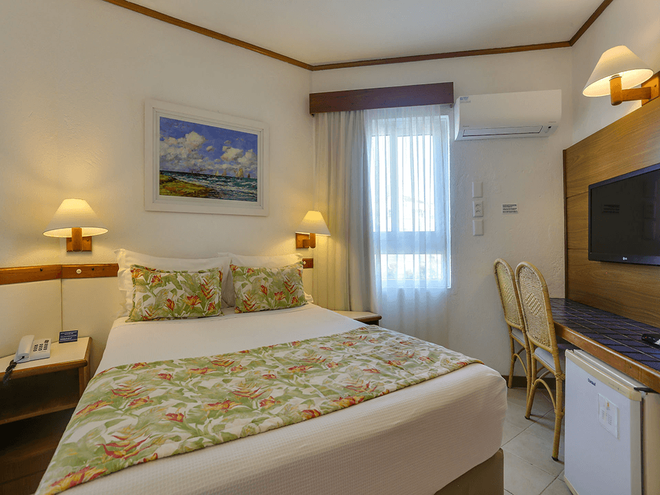 Acomoda até 02 pessoas, com cama de casal ou duas de solteiro. Vista para a rua.