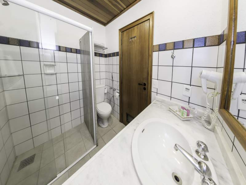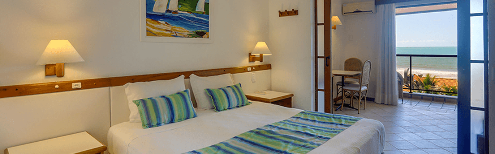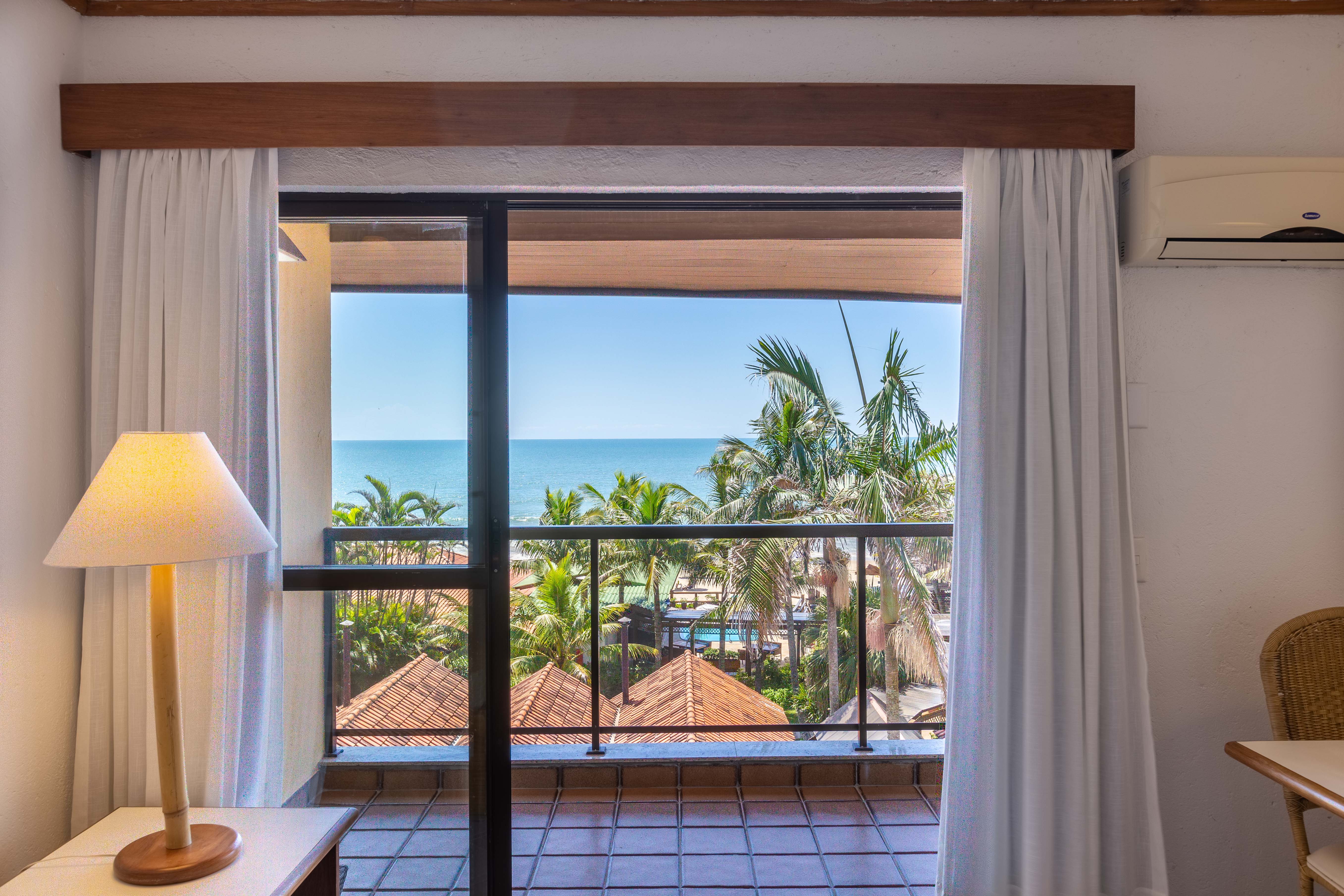 Acomoda até 04 pessoas, dispõe de dois ambientes, sala e quarto separados por porta de correr de vidro fosco. No quarto cama de casal ou duas de solteiro, na sala sofá cama com bicama. Sacada frente ao mar.